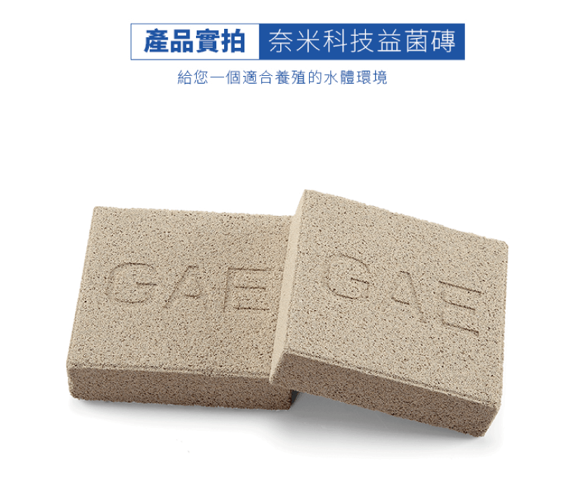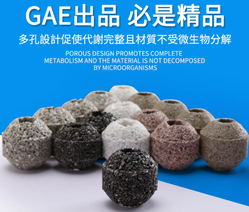 所謂水養魚、魚養菌、菌養水這是一個循環的鐵三角。要養好 菌、養好水就必需要靠好的濾材。台灣 GAE 培菌球採用環保陶瓷高溫燒 結而成,不會脆裂分解,長期使用亦不會影響水質。其培菌效果是傳統坊 間所銷售的濾材 10 倍。台灣 GAE 培菌球能讓您的愛魚活在像大自然的環境中。